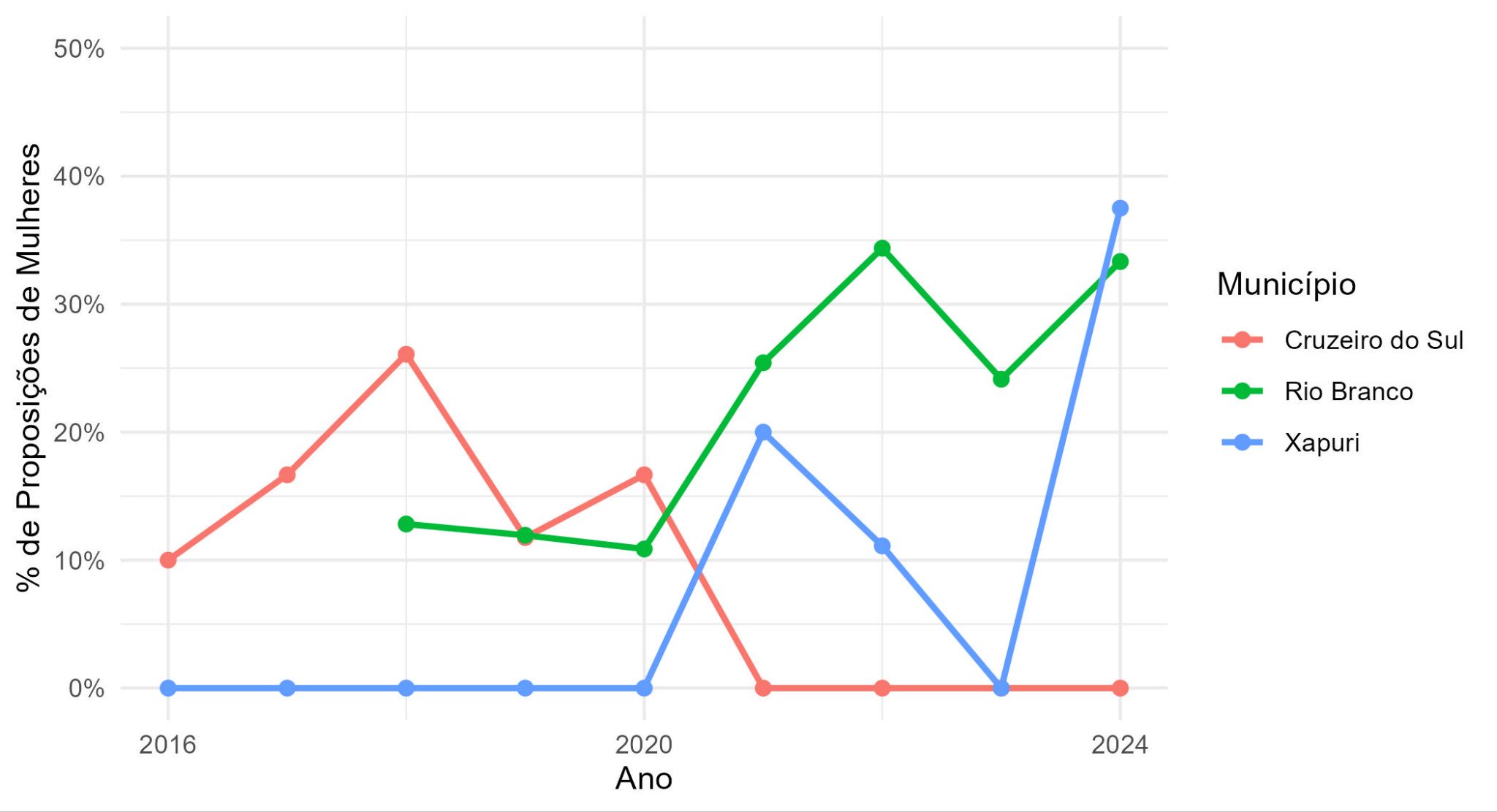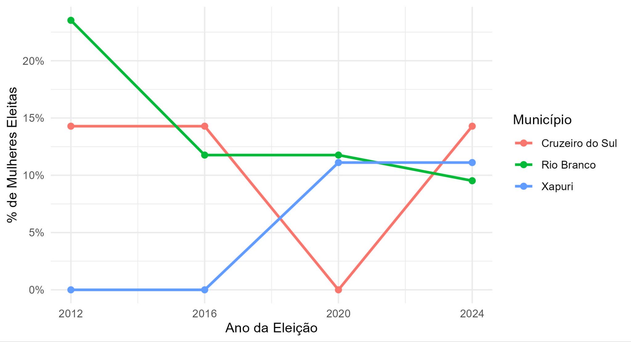 Cruzeiro do Sul também tem uma legislatura sem vereadora, com nenhuma eleita em 2020, e duas mulheres eleitas em todas as outras três eleições. Já em Rio Branco, houve ao menos duas vereadoras eleitas em todos os anos considerados, com destaque para 2012, quando quatro das 17 cadeiras foram ocupadas por mulheres. Em 2024, embora o número absoluto de vereadoras eleitas tenha se mantido, a ampliação da Câmara Municipal de 17 para 24 cadeiras resultou em uma diminuição da proporção de assentos ocupados por mulheres.
