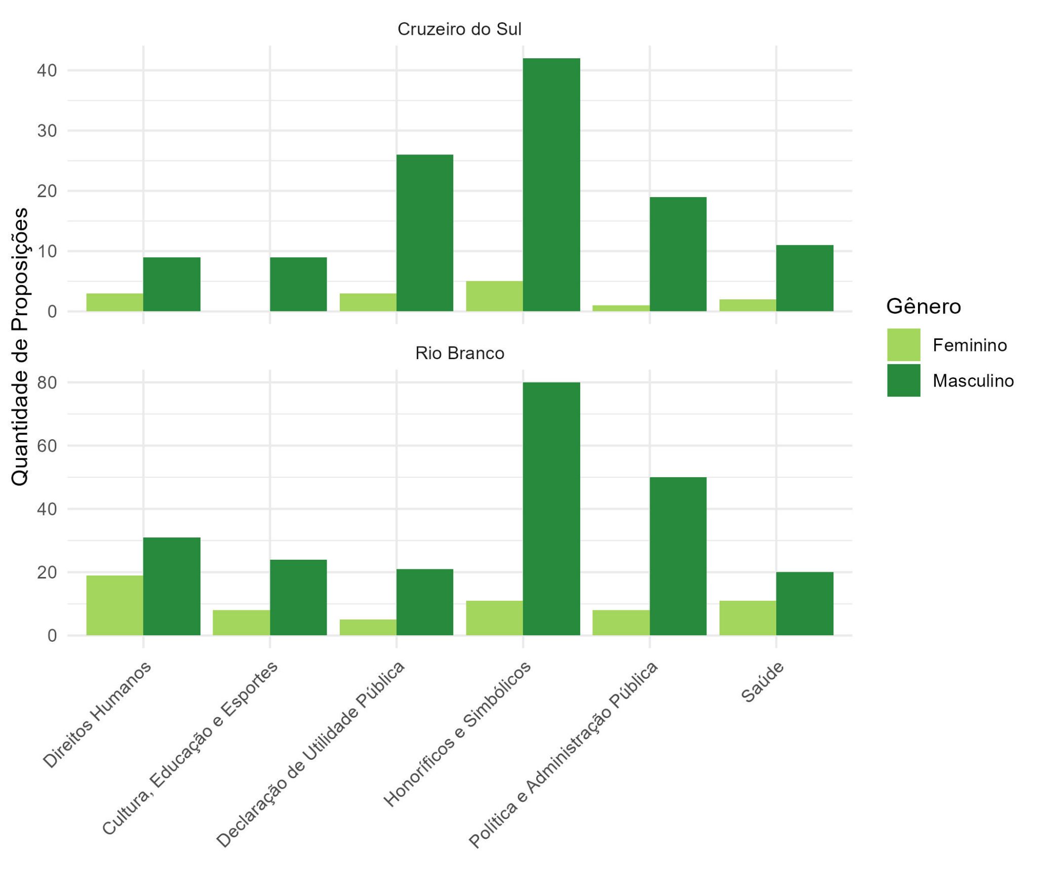 Ao analisarmos as temáticas abordadas na produção legislativa, as diferenças tornam-se mais evidentes. Em Rio Branco e Cruzeiro do Sul, as vereadoras se concentraram, proporcionalmente, em maior grau do que seus colegas homens, em proposições relacionadas aos Direitos Humanos e à Saúde. Isso sugere que a produção legislativa dessas câmaras poderia assumir contornos distintos caso houvesse uma representação mais significativa de mulheres.