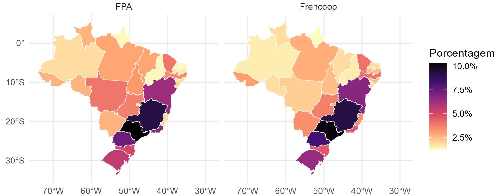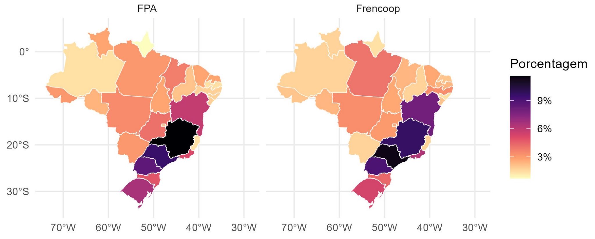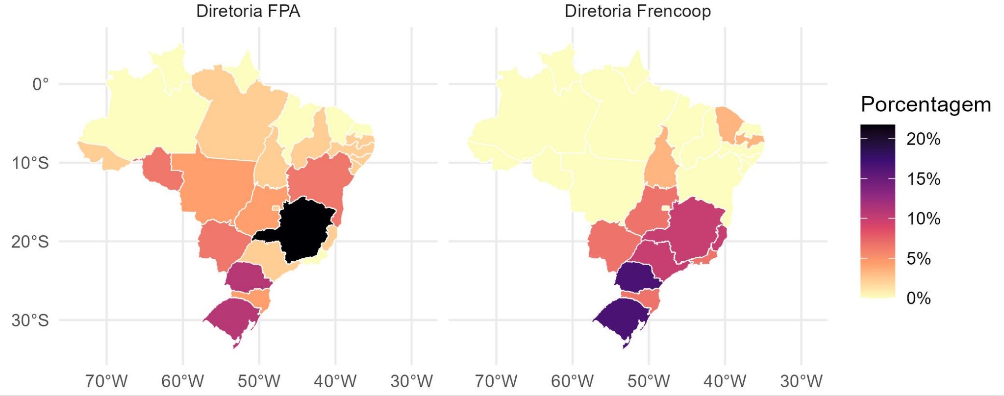 Vemos, portanto, que a sobre representação dos estados do sul e sudeste, apontada no boletim anterior, se estende para a 56ª legislatura na Frencoop, e não é reflexo de um desequilíbrio de representação da FPA. A bancada ruralista tem forte representação dos estados do sul e de Minas Gerais, principalmente, mas mantém uma distribuição menos desigual que a Frencoop.