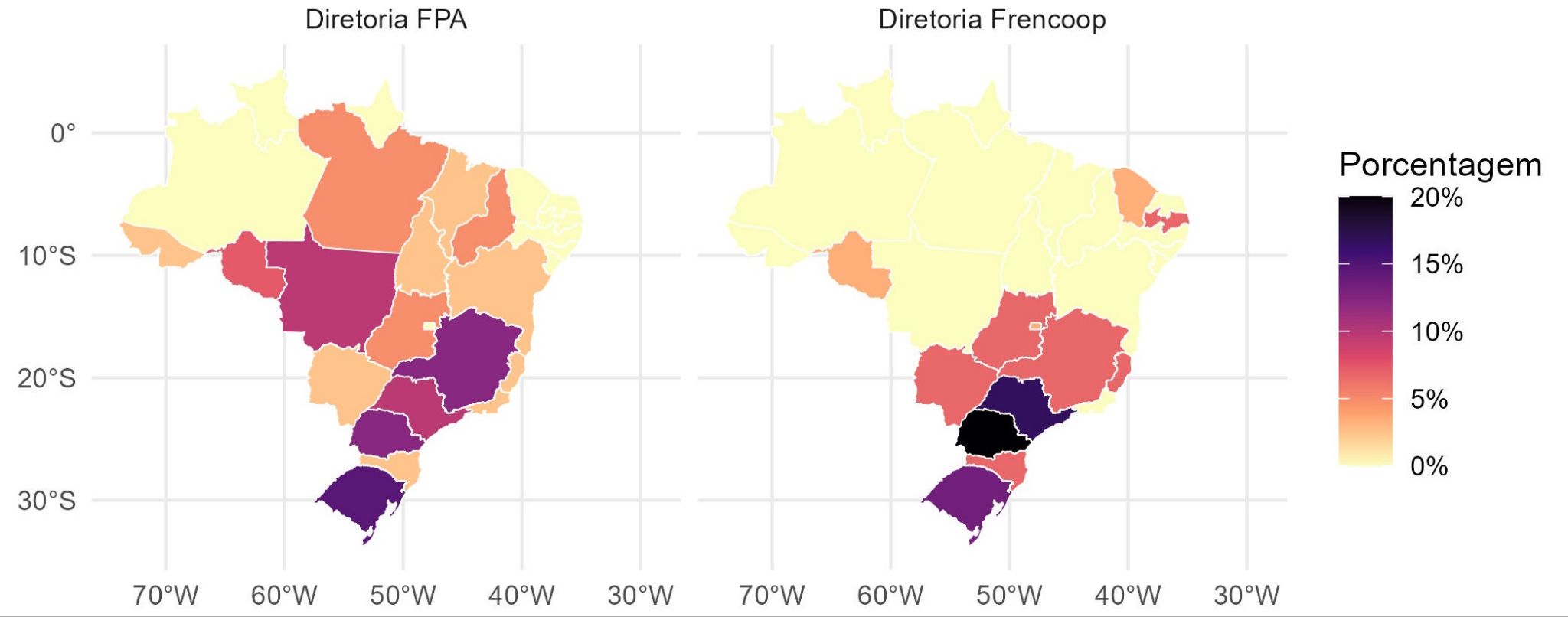 Ao longo deste boletim, mostramos que a Frente Parlamentar do Cooperativismo (Frencoop) e a Frente Parlamentar da Agropecuária (FPA) possuem uma grande proximidade de membros assinantes e de diretores ao longo do período entre 2019 e 2025. Apesar disso, a Frencoop mantém, nas duas legislaturas, uma desigualdade maior de representação dos estados em sua diretoria do que a observada na FPA, e que não é tão acentuada na distribuição de seus membros.