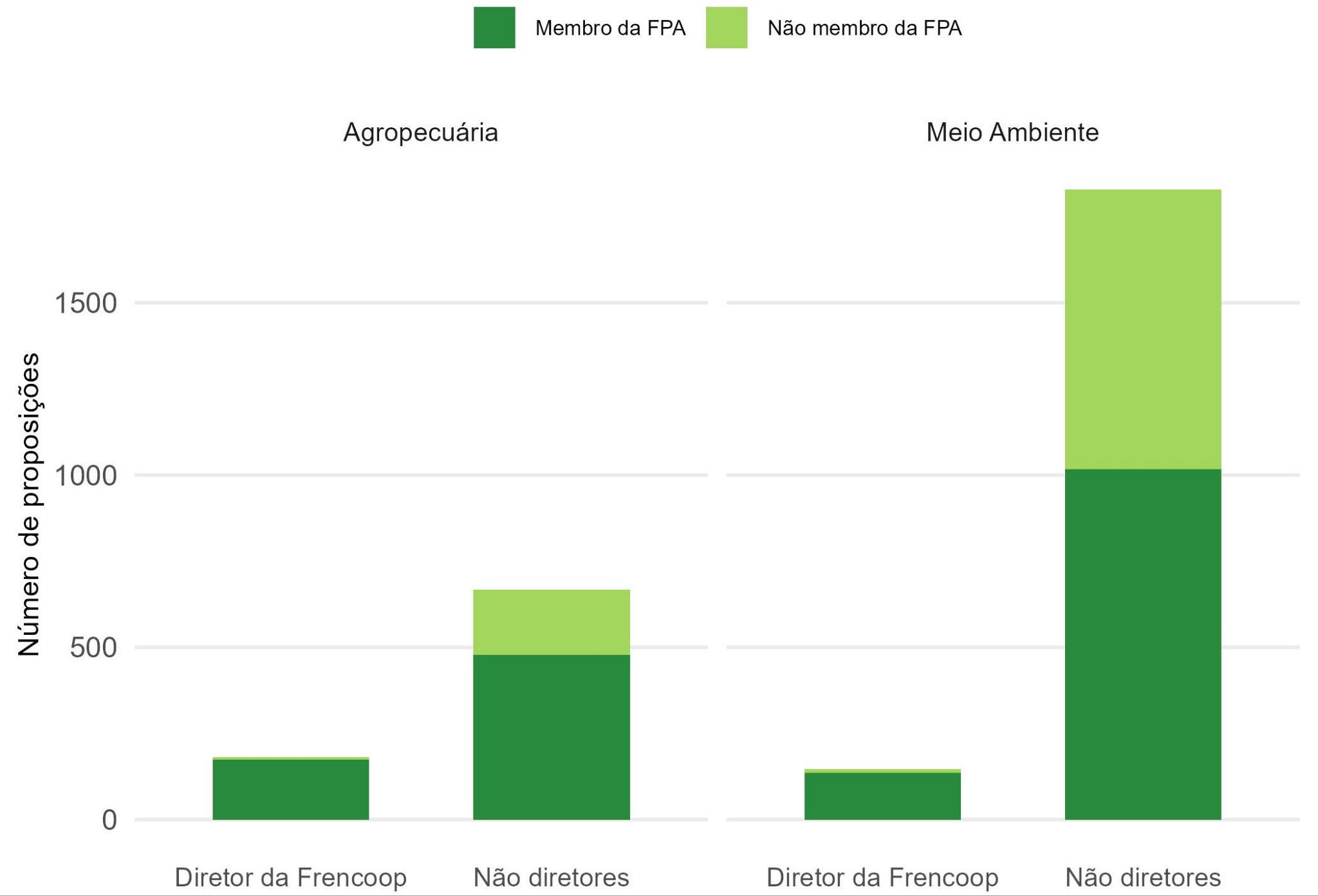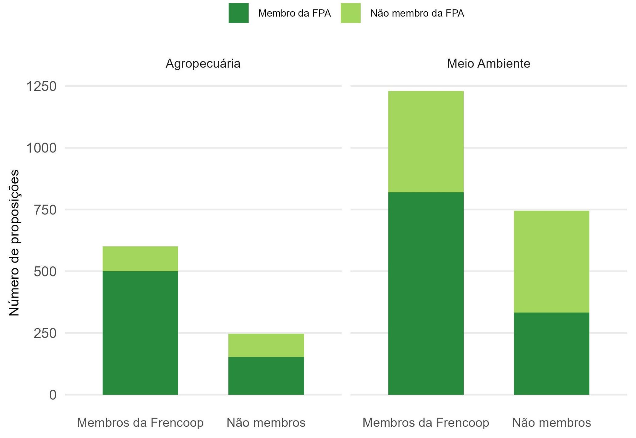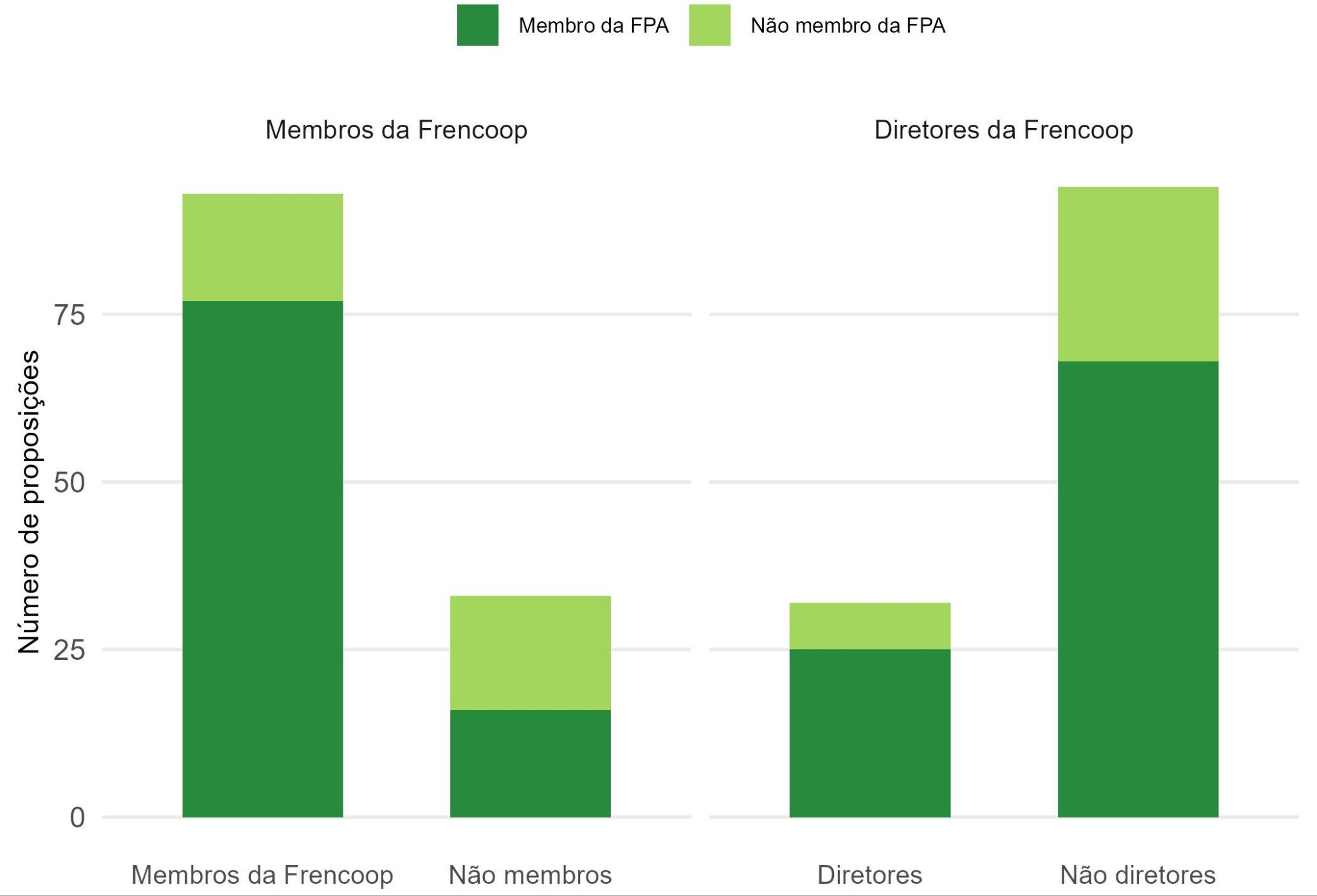 Cada barra representa a quantidade de proposições apresentadas por membros e não membros da Frencoop. As cores representam o pertencimento à FPA.