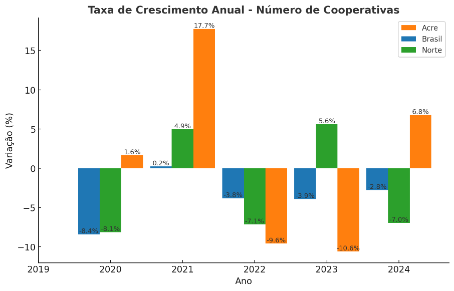 Figura 1: Taxa de crescimento anual (%) do número de cooperativas – Brasil, Norte e Acre (2019 – 2024)