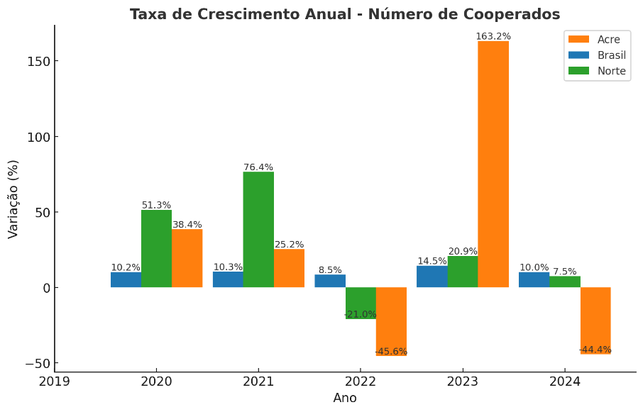 Figura 2: Taxa de crescimento anual (%) do número de cooperados – Brasil, Norte e Acre (2019 – 2024)