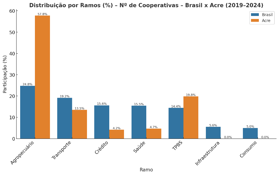 Figura 3: Distribuição por ramos (%) – número de cooperativas – Brasil x Acre (2019 – 2024)