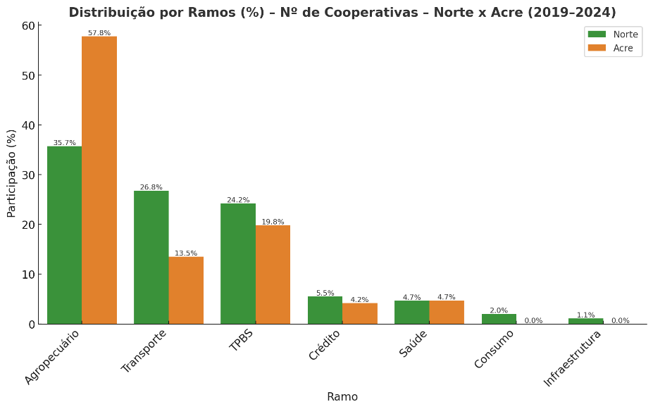 Ao comparar o Acre com a região Norte, os dados do Anuário indicam que, embora em menor escala, o cooperativismo regional também é caracterizado pelo predomínio do ramo Agropecuário, seguido pelos setores de Transporte e Trabalho, Produção de Bens e Serviços (TPBS). Entretanto, a intensidade relativa do ramo Agropecuário no Acre é superior à média regional, o que evidencia uma concentração mais acentuada (Figura 4).