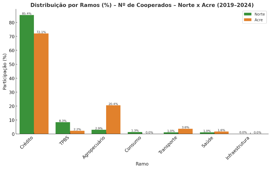 Figura 4: Distribuição por ramos (%) – número de cooperativas – Norte x Acre (2019 – 2024)