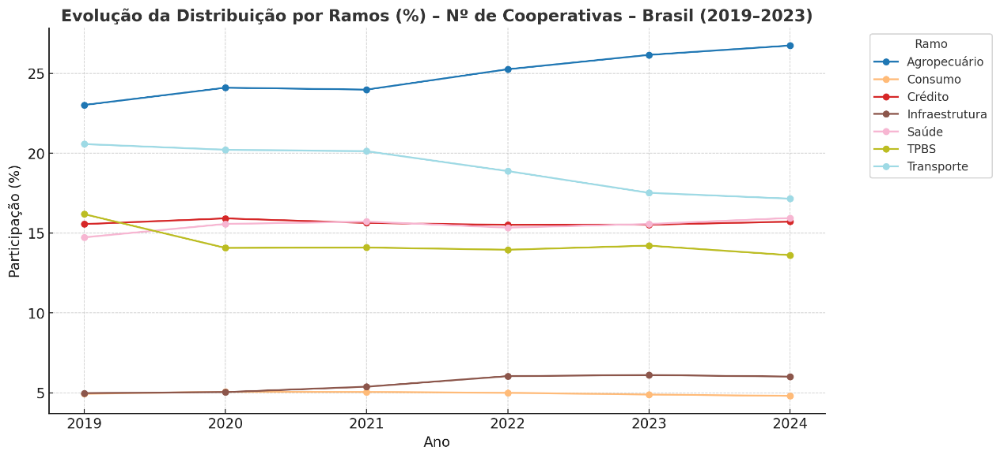 Figura 6: Evolução da distribuição por ramos (%) – número de cooperativas – Brasil (2019 – 2024)