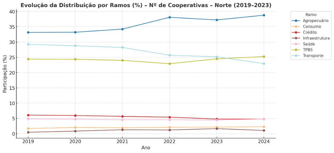 Figura 7: Evolução da distribuição por ramos (%) – número de cooperativas – Norte (2019 – 2024)