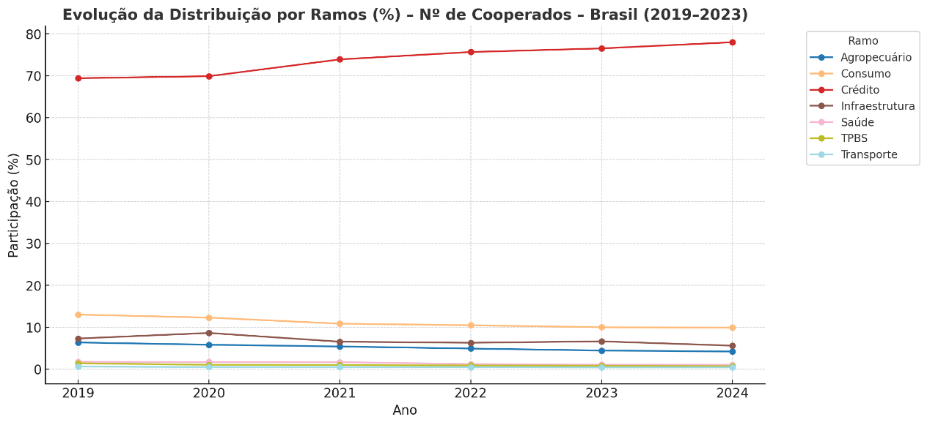 Figura 9: Evolução da distribuição por ramos (%) – número de cooperados – Brasil (2019 – 2024)