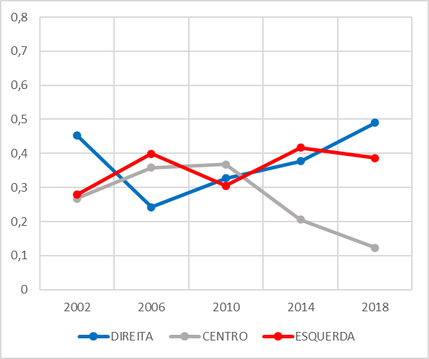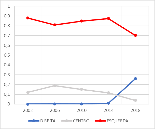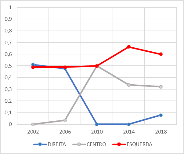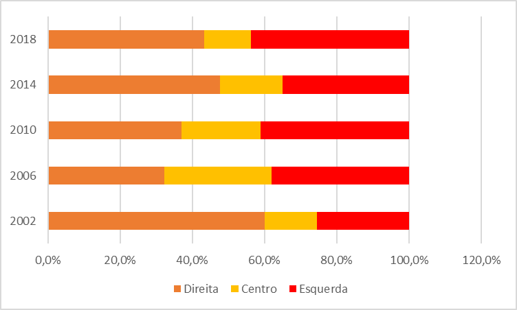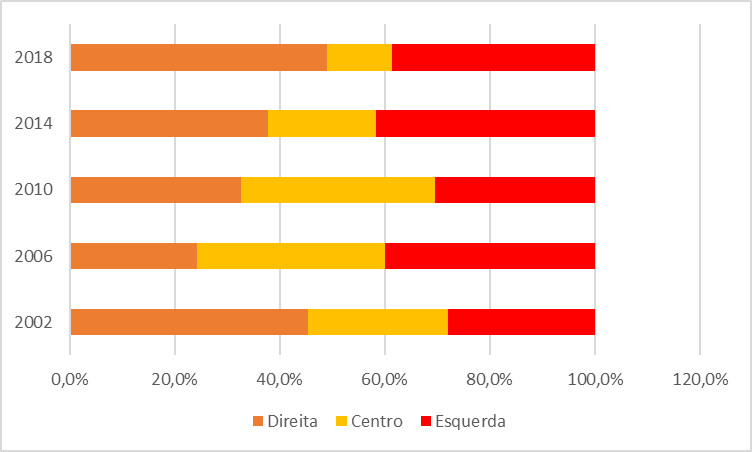 Em relação à ideologia, a dinâmica das disputas partidárias entre direita, esquerda e centro, apontam tendências distintas das verificada nas disputas para o Executivo, pois os partidos de direita têm ligeira vantagem sobre a esquerda (Apêndice 1). Também se destaca a presença constante e significativa de partidos de centro, perceptível no montante de votos obtidos no período e potencialidade de definir o campo majoritário, a depender do seu deslocamento para a direta ou para a esquerda.