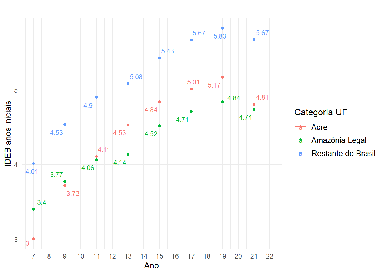 Na figura 1, apresentamos os resultados das médias municipais do IDEB para os anos iniciais, discriminando o caso acreano, os demais estados da Amazônia Legal e o restante do Brasil (no eixo x, os valores indicam os anos, sendo 7 igual a 2007 e assim por diante).