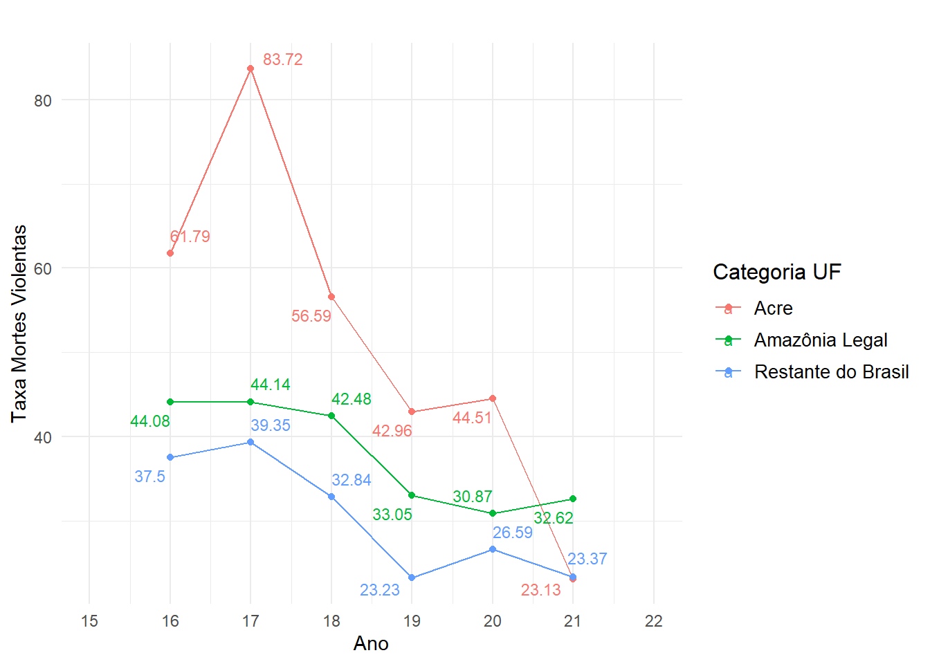 Na figura 10, apresentamos os dados de mortes violentas (taxa por 100 mil habitantes). Os valores indicam um pico de violência no ano de 2017 e um decréscimo constante no caso acreano. Como apontado por uma série de pesquisas sobre violência no Brasil, os dados de homicídio devem ser vistos com cautela29–31. Aspectos como a subnotificação de homicídios (mortes sem causa determinada) e possíveis armistícios entre facções criminosas podem explicar parte da queda recente de homicídios no Brasil. Entre 2021 e 2022, o número de homicídios cresceu quase 16% no Acre (conforme dados mais recentes do FBSP).
