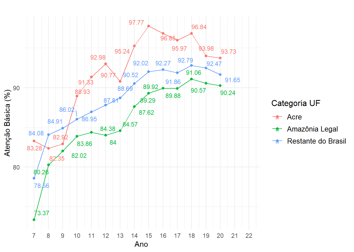 A Figura 5 destaca a cobertura da atenção básica em saúde no Acre, comparando-a com a Amazônia Legal e o restante do Brasil. Diferentemente dos outros dados, aqui o Acre se destaca positivamente, apresentando uma cobertura consistentemente superior à média das outras regiões. Isso indica um esforço significativo do estado em garantir que a população tenha acesso aos serviços básicos de saúde.