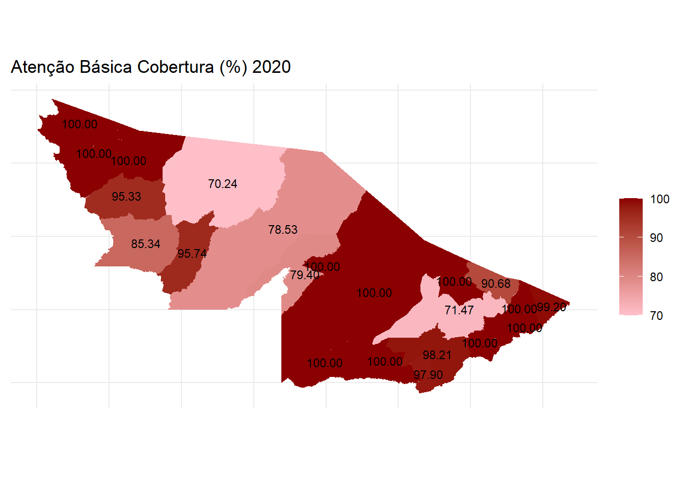Para o último da série, em média, o percentual da população coberta pela atenção básica é de 93,73%. Em termos da distribuição no estado, os dados indicam boa cobertura geral. O caso de Rio Branco, na figura 6, é destoante. O município, apesar de apresentar PIB que é mais de 50% do PIB acreano26, possui cobertura de atenção básica abaixo da média em mais de 25 pontos percentuais em relação a municípios vizinhos.