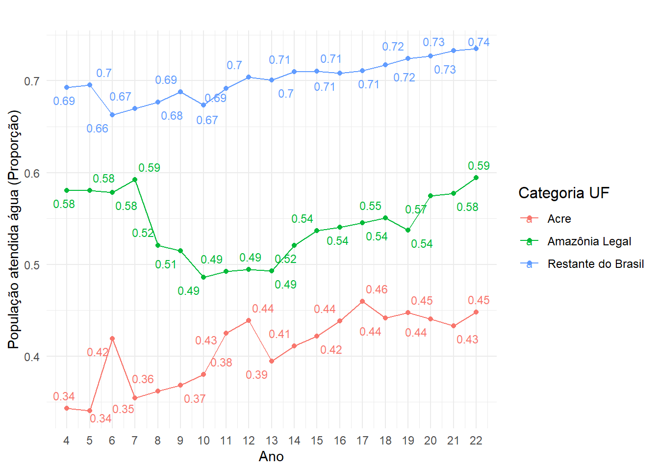 A Figura 7 ilustra a proporção da população atendida com água potável adequada no Acre, em comparação com outras regiões do Brasil. Embora tenha havido melhorias, o Acre ainda está abaixo da média nacional, o que sinaliza a necessidade de investimentos contínuos em infraestrutura de saneamento básico. A falta de acesso adequado à água potável tem implicações diretas na saúde pública e na qualidade de vida, sendo essencial que políticas públicas sejam direcionadas para melhorar essa situação. Ponto bastante discutido em planos de governo dos candidatos à prefeitura pelo estado.