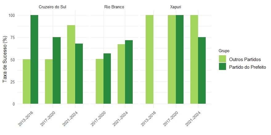 Em Rio Branco, observa-se um padrão consistente nas duas legislaturas analisadas: parlamentares filiados ao partido do prefeito apresentam maior taxa de sucesso na aprovação de suas proposições. Em Cruzeiro do Sul, as duas primeiras legislaturas mostram considerável maior capacidade de aprovação das proposições para os vereadores do MDB durante os governos deste partido. No entanto, há uma queda para o mandato de Zequinha Lima (PP) e um aumento da eficiência de outros partidos. Essa mudança pode estar relacionada ao MDB, que manteve 83,3% de sucesso em suas proposições, mesmo sem o controle da prefeitura. O partido elegeu 4, 5 e 4 vereadores nas três legislaturas analisadas, do total de 14 cadeiras. O PP, por sua vez, apresentou um salto em sua taxa de sucesso: de 44,4% na legislatura anterior para 67,9% após assumir o Executivo. Esse desempenho coincide com o aumento de sua representação na Câmara, passando de apenas uma cadeira em 2016 para três em 2020.