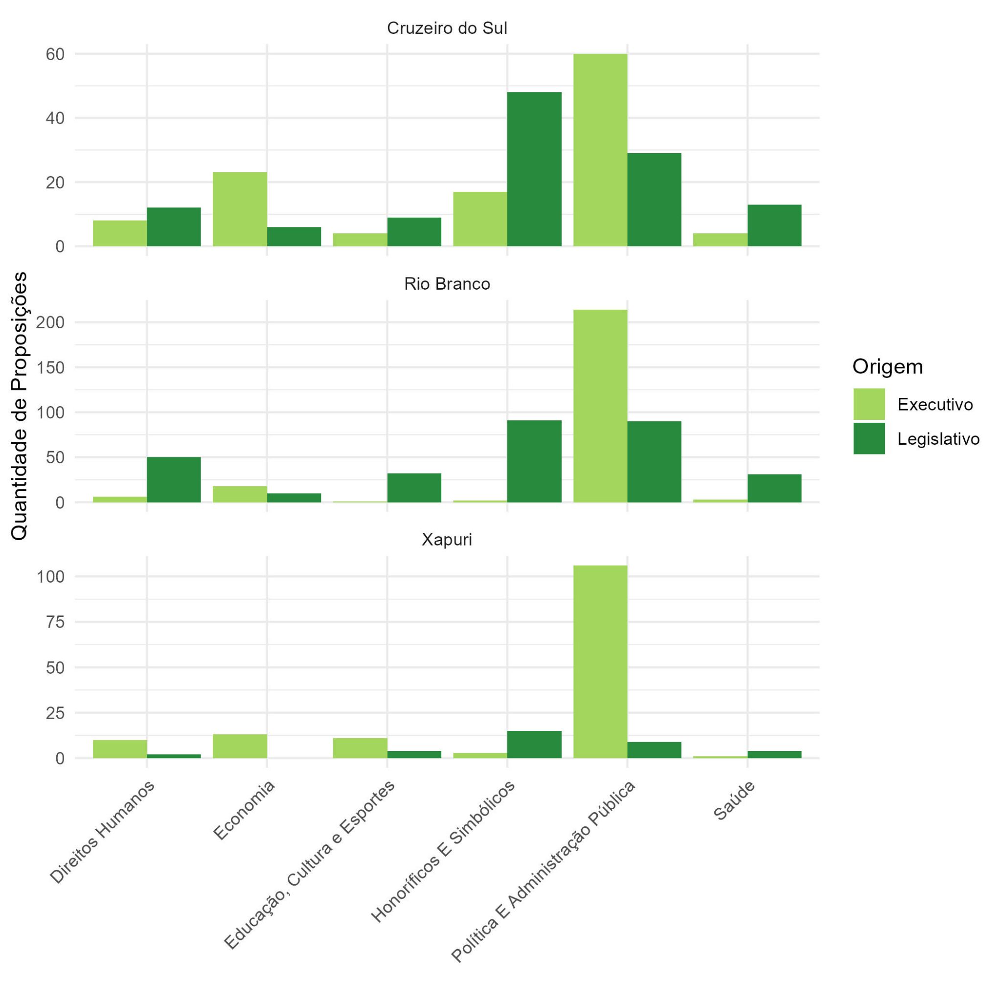 Em todos os municípios analisados, observa-se que as proposições sobre Administração Pública são majoritariamente de autoria do Executivo, enquanto as categorias Honoríficas e Simbólicas são predominantemente apresentadas pelo Legislativo, como esperado. Dois outros padrões relevantes também se destacam: a predominância do Executivo nas proposições relacionadas à Economia e a maior atuação do Legislativo em temas ligados à Saúde. Para Rio Branco e Cruzeiro do Sul, ainda é relevante a participação dos vereadores nos temas de Direitos Humanos, Educação, Cultura e Esportes.