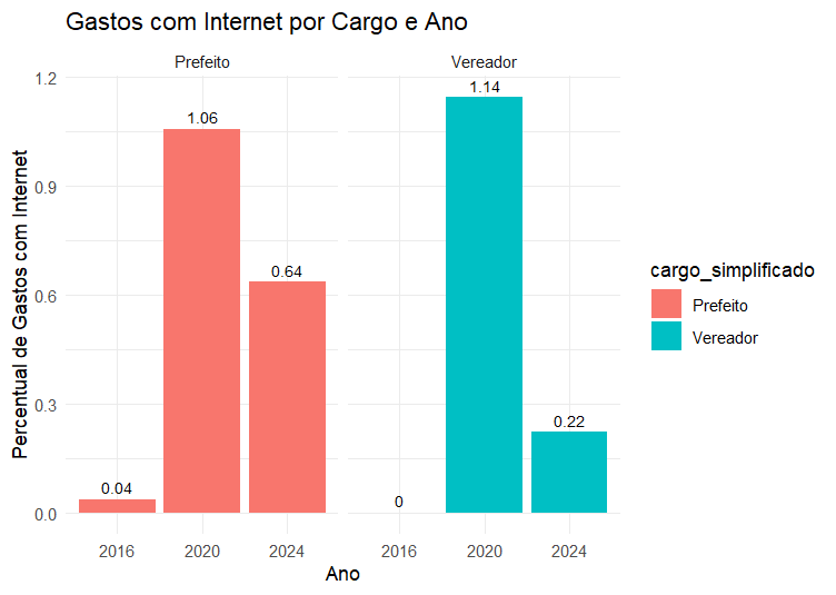 Para avaliar a evolução dos gastos com redes sociais e internet nas eleições locais brasileiras, criamos uma variável intitulada gastos com internet. Quando candidatos preenchem sua prestação de contas, destacam a descrição e tipo de despesa. Consideramos os tipos: “criação e inclusão de páginas na internet”, “despesa com impulsionamento de conteúdos”, como gastos com internet. Seguimos classificação já realizadas na literatura sobre o tema na Ciência Política10–12. É importante considerar que as despesas de 2024 ainda não são as definitivas.