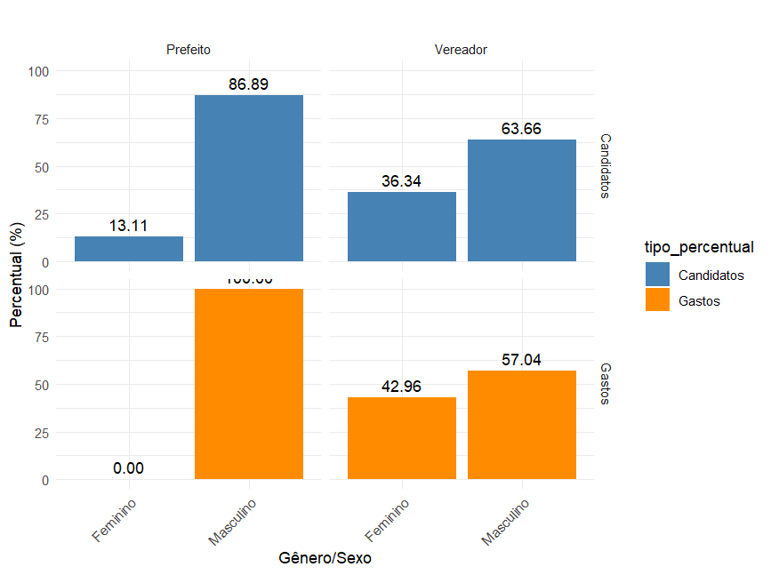 Na figura 2, expomos a relação entre despesas com internet e gênero dos candidatos. No canto esquerdo, estão distribuídos os valores para candidatos a prefeito e à direita para vereador. Os valores da linha superior indicam o número de candidatos por categoria de gênero, e os da linha inferior indicam o percentual de despesas com internet nas campanhas. Por exemplo, dos mais de 2 mil candidatos a prefeito registrados nas eleições de 2024, 86,89% eram homens. No entanto, eles foram responsáveis por 100,00% de todo o investimento das campanhas com internet. Ou seja, postulantes homens às prefeituras investiram de forma massiva no impulsionamento de conteúdo e criação de páginas e sites. No caso de vereadores, a distribuição entre gastos e candidaturas é mais equilibrada entre os grupos. O resultado segue padrão nacional14.
