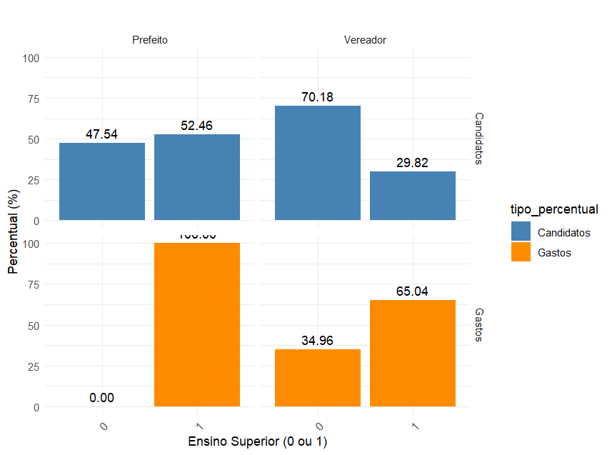 Ao olharmos para os gastos, vemos que candidatos com ensino superior tendem a gastar mais com internet. A diferença entre percentuais de candidatos e gastos é positiva e bastante acentuada para os dois cargos. Por exemplo, na disputa de vereador, enquanto apenas 29,82% dos candidatos têm ensino superior, eles respondem por mais de 65% dos gastos nas redes. Isso pode indicar que candidatos com escolaridade mais alta dão mais importância a esses meios de comunicação, além de terem maior domínio das ferramentas e recursos necessários para usá-los.
