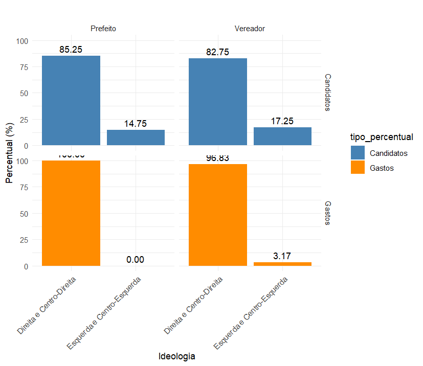 Vemos que candidatos à esquerda e à direita, sejam postulantes à prefeitura ou vereança, apresentam diferenças significativas quando comparados os percentuais de candidaturas x gastos. Em outras palavras, o percentual do gasto não segue exatamente o percentual que cada grupo representa no total de candidatos. Assim, pelo menos no nível agregado, parece que a direita prioriza mais a comunicação nas redes quando distribuem seus gastos de campanha. Esse resultado é distinto do padrão nacional, onde, para o pleito de 2024, há equalização do gasto com internet e candidaturas entre os dois campos ideológicos.