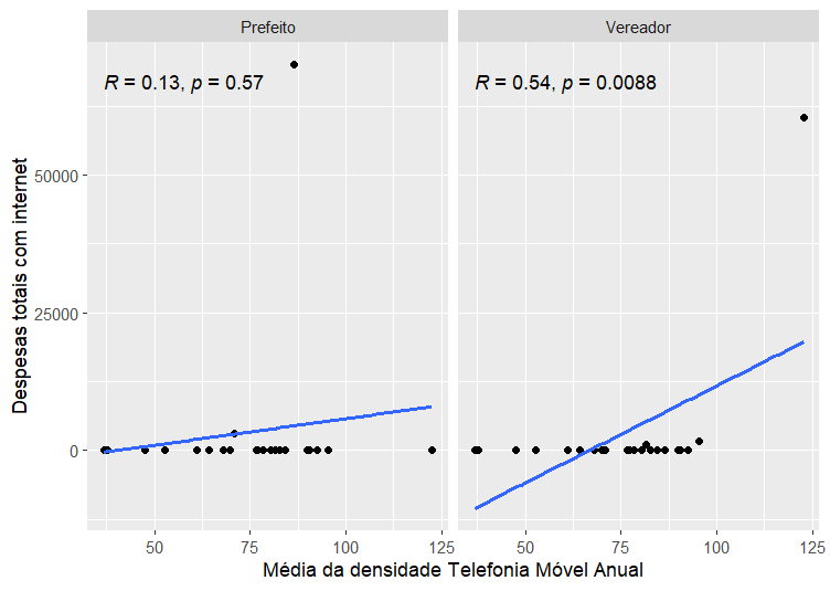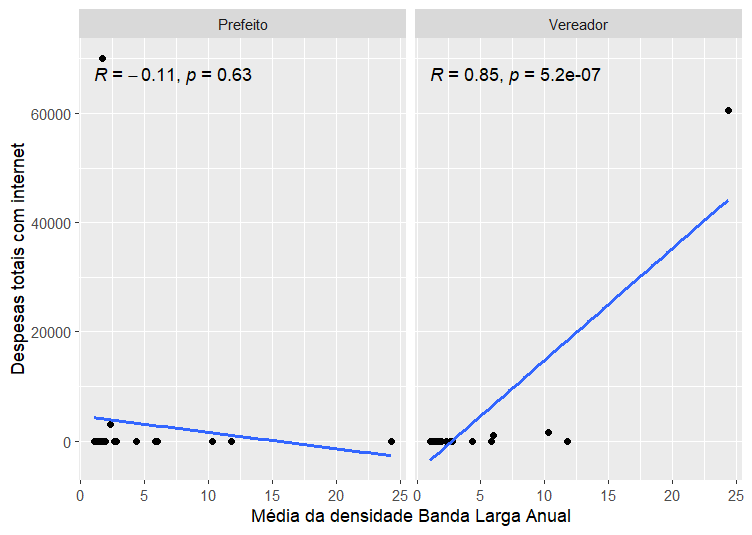 Passamos agora a análise da relação entre a cobertura da internet e os gastos com internet. Na figura 5 e 6, testamos a correlação entre densidade da banda larga nos municípios e densidade de telefonia móvel (X) e o percentual de gastos com internet no nível do município para candidatos a prefeito (Y). Ou seja, calculamos o total de despesas realizadas por todos os candidatos e, deste valor, o percentual de gastos com internet. A ideia é verificar em que medida há uma opção estratégica em aumentar esse tipo de despesa em localidades nas quais as pessoas têm mais acesso à conexão online. Os resultados do coeficiente de correlação de Pearson, para o caso de vereadores, indicam valores moderados, mas positivos e estatisticamente significativos. Em outras palavras, à medida em que aumenta a cobertura de internet no município, o gasto com esse tipo de estratégia de campanha também aumenta. No caso de prefeitos, essa relação não se verifica: não há correlação significa entre as duas variáveis.