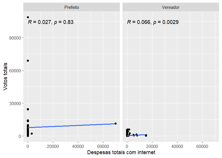 Já no caso dos candidatos a vereador, o coeficiente de correlação é pequeno (R = 0,066), mas estatisticamente significativo (p = 0,0029), sugerindo que, embora modesta, há uma associação positiva entre gastos com internet e votos. Esse resultado, ainda que limitado, reforça achados anteriores do boletim: vereadores investem proporcionalmente mais em redes sociais e candidatos com maior escolaridade ou pertencentes à direita tendem a valorizar mais essas estratégias digitais. A correlação, ainda que fraca, aponta que, para campanhas proporcionais, a presença online pode representar uma vantagem competitiva marginal — especialmente em municípios com maior cobertura digital, como mostrado nas Figuras 5 e 6.